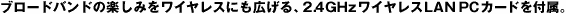 PCカード*2を付属*3。ワイヤレスLAN(IEEE802.11b)環境のある自宅や外出先で、あるいは、別売のワイヤレスLANアクセスポイントPCWA-A200との組み合わせで、快適にブロードバンドが楽しめます。