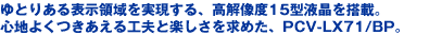 気持ちよく使える高性能を、スマートにスタイリッシュにひめたPCV-LX71/BP。1280×960ドットの高解像度15型液晶ディスプレイを採用し、ゆとりある表示領域を実現。複数のアプリケーションウインドウも、余裕をもって扱えよう配慮しました。ドライブは、画像なども手軽に保存できるCD-RW。さらに、PentiumIIIプロセッサー933MHz、40GBハードディスクなど充実のスペックにより、広がる楽しさを心地よく味わえます。