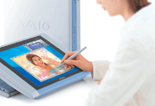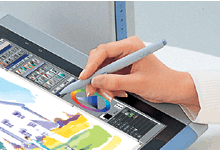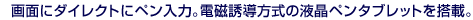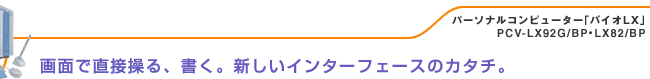 PCV-LX92G/BP・LX82/BPのディスプレイには、液晶ペンタブレットを採用。クリックやダブルクリックの操作、文字入力、さらに描画まで、さまざまな入力が、専用ペンを使い画面で直接行えます。ペン先にしか反応しない電磁誘導方式により、手をついて楽に正確に操作が可能。同時に、高い読みとり精度と、ほぼ時間差なくペンの位置をカーソル表示できる快適な読みとり速度を実現しました。筆圧も256レベルで感知し、対応ソフトを使用すれば、線の太さや濃淡を自在に表現できます。 |