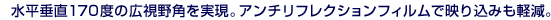 ディスプレイサイドから眺めても画面が鮮やかに映る、広視野角液晶ディスプレイを搭載。水平垂直ともに170度の視野角を実現し、くつろぎながらペン操作が行えます。映り込みも、画面に貼ったアンチリフレクションフィルムにより軽減。さらに、ペン操作による傷・衝撃から液晶画面を守る、保護ガラスも備えました。 |