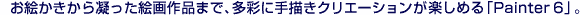 フリーハンド感覚でお絵かきが楽しめるペイント作成ソフト「Painter 6」。気軽なお絵かきから高度な絵画作品づくりまで、描く楽しみを幅広く実現します。クレヨンや水彩絵の具といった馴染みのある画材はもちろん、本格的なエアブラシやドライメディアなど、多彩な、そしてリアルな「ブラシ(画材)」を搭載。さらに、実際の画材だけでなく、パソコンならではの「ゴッホタッチ」「スーラタッチ」などの斬新な「ブラシ」も備えました。豊富な画材からイメージにあった絵筆を選択でき、オリジナリティあふれる作品づくりにチャレンジできます。もちろん筆圧感知に対応し、ラインのアクセントや色の濃淡も手元で調整可能。また実際の描画と違い、描いた線や色合いが気に入らなければ、気軽に取り消して描き直せます。 |