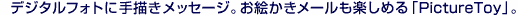 デジタルフォトに気軽に描き込みができる「PictureToy」。さまざまなデジタル画材、多彩なカラーを用意し、カラフルなお絵かきが楽しめます。筆圧対応により、線の太さも自由に調整可能。何度でも取り消しができるため、気ままにどんどん描き込めます。人物に「サングラス」を付けたり、背景に「虹」や「花」などを付けられる「スタンプ」ツールで、作品はますますにぎやかに。できあがったら、メールに貼り付けて一緒に送信。作品中にメッセージも書き込めば、見せる楽しみがますますアップします。ほかにも、「Navin' You Ver.5.1」と連携し、道順を描き込んだデジタルマップをメール送信したり、気になるホームページにコメントを描き入れ保存したりと便利に活用できます。 |