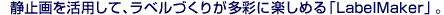 デジタルカメラで撮った画像などを使って、CDやMDなどのラベルプリントが楽しめる「LabelMaker(ラベルメーカー)」。わかりやすいガイドに沿って手軽にラベルづくりができます。また、CDやMDに加え、各種ビデオテープやメモリースティックなど、12カテゴリー200種類以上のさまざまなメディアのテンプレートも用意。あらかじめデザインされたテンプレートも備えており、曲名などを加えるだけで手軽にラベルが作れるほか、画像にペンで直接、文字や絵、スタンプなどを加えるなど、アレンジも楽しめます。さらに、オンラインCDショップ「CDNOW JAPAN」と連携して、曲名やアーティスト名などの情報を、そのままラベルに取り込むことも可能です。 |