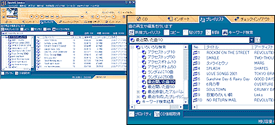 | ハードディスクにストックした音楽は、プレイリストでわかりやすいツリー状にして管理できます。お気に入りの曲を集めてオリジナルアルバムを作ることも可能。音楽を 自由に組み合わせて、ジュークボックス感覚で再生できます。また、「最近聞いた曲」やキーワードによる検索も可能です。 |