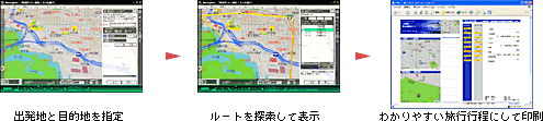 | インターネット上でホテルの検索・宿泊予約などができる「旅の窓口」・「JTB国内宿泊」、レストランなどの検索ができる「MAPOO(マップー)」、チケット予約やエンターテインメント情報を検索できる「e+(イープラス)」などと連携。気に入った情報は自動的にユーザーズポイントに登録されるとともにダイレクトに地図上に表示されます。トラベルルート探索機能と連動すれば、コンサート会場に開演時間までに到着できる旅程を調べる、といった便利な使い方も可能です。 | ||||||||