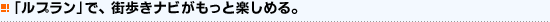 「ルプラン」は、ソニーが提案する「クリエ」を使ったヒューマンナビゲーションサービスです。全国政令指定都市の「詳細地図」*と好きな「ガイド情報」*をWEB経由でダウンロード購入すれば、新しい街歩きのスタイルが実現します。