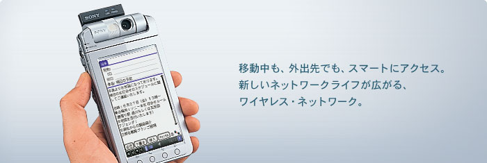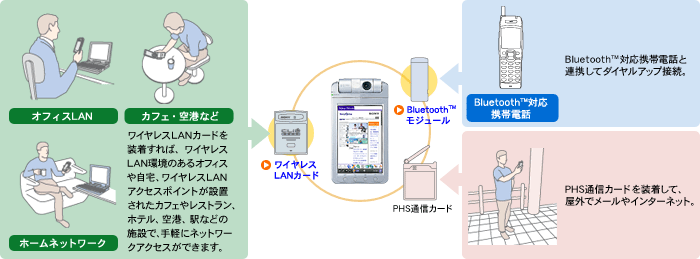 などで、手軽にネットワークアクセスが可能。また、別売のBluetooth(TM)モジュールPEGA-MSB1を「メモリースティックスロット」に差し込んで、対応の携帯電話を使ったダイヤルアップ接続も可能です。