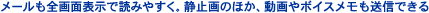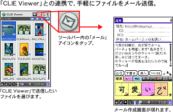 320×480ドット表示にも対応した「CLIE Mail」。スモールフォント対応で、一画面により多くの情報を表示させることが可能となりました。「クリエ」で撮影した静止画はもちろん、動画やボイスメモなどもメールに添付して送信できます。