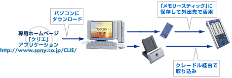 | 「クリエ」の世界は、ネットワークからも広がってゆきます。専用アプリケーションやコンテンツをWeb上に用意し、楽しさ・便利さがパワーアップ。さらにパソコンやビジュアル機器とも連携して、インターネットを活用した新しい楽しみが生まれます。 |