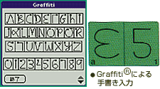 | 「Palm OS(R)」では、ほとんどのアルファベットや数字が一筆書きで入力可能な簡略文字「Graffiti(R)」を採用しています。もちろん日本語にも、ローマ字入力で対応。モバイルシーンでも素早い手書き入力が実現します。 |