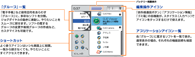 アプリケーション選択画面(ランチャー)には、「クリエ」オリジナルの「CLIE Launcher」を採用。ジョグダイヤルを使ってのスピーディーな操作が可能で、使用目的ごとに並んだアイコンからやりたいことにスムーズにアクセスできます。さらに、ショートカットエリアによく使う機能のアイコンを配置したり、あまり使わないアイコンをメニューから削除したりと、自分に使いやすいようにカスタマイズも自在です。