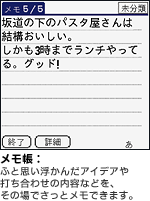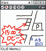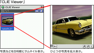スタイラス(入力ペン)を使って、フリーハンドで書いた手書き文字やイラストをそのままメモとして残すことができ、関連する複数枚のメモはノートのページとして保存できます。「手書きメモ」一覧画面では、ノートタイトルとページのサムネイルが確認できます。また、「CLIE Viewer」でも、写真などとまとめて管理・閲覧が可能です。