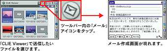 480×320ドットの横長画面にも対応した「CLIE Mail」。「クリエ」で撮影した静止画はもちろん、動画やボイスメモなどもメールに添付して送信できます。