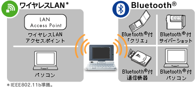 また、Bluetooth機能の内蔵により、ハギワラシスコム社製Bluetoothモバイルアクセスステーション「B-Port II」とNTTドコモ製PHSカード(@FreeD)、携帯電話カード(FOMA)の組み合わせで、電波の届く場所でのワイヤレスインターネットアクセスを実現します。(2003年10月追記)