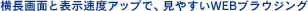 横長ディスプレイ(480×320ドット)採用により、インターネットの画面をパソコン上と同じイメージの横長画面で閲覧可能。さらに、表示可能なページサイズと表示スピードがアップして、WEBブラウジングがいっそう快適に楽しめます。
