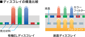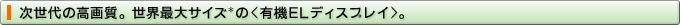 バックライトからの透過光によって表示する液晶ディスプレイに対して、物質自体が発光する素子を使った〈有機ELディスプレイ〉。光量のロスが少なく、色再現性とコントラストに優れています。180度の広視野角、桁違いの応答速度も実現し、従来の表現領域を超えた美しい画像を再生します。
