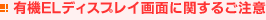 有機ELディスプレイは非常に精密度の高い技術で作られていますが、画素欠けや常時点灯する画素等があります。また、見る角度によってすじ状の色むらや明るさのむらが見える場合があります。これらは有機ELディスプレイの構造によるもので、故障ではありません。 |