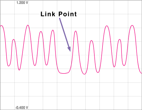 | 上の図は、CD-Rディスクで書きつなぎが行われた点の前後を再生した時のRF波形(ディスクから反射されたレーザ光の強度に比例したアナログ信号)です。波形の低い部分が記録された低反射率(暗い)のマーク部、高い部分が高反射率(明るい)のランド部に相当します。書きつなぎは図中央のタイミングで行われていますが、前後の波形がスムーズにつながっている様子が分かります。書きつなぎ点での位置とタイミングのずれの誤差は、CD規格(Red