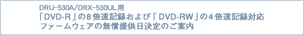 1月13日(火)付でご案内しておりました、DVD/CDリライタブルドライブ DRU-530A/DRX-530UL(既発売)用ファームウェアを2月27日(金)から公開します。今回のファームウェアへのアップデートを行う事で、新たにDVD-R 8倍速記録およびDVD-RW 4倍速記録への対応を実現します。