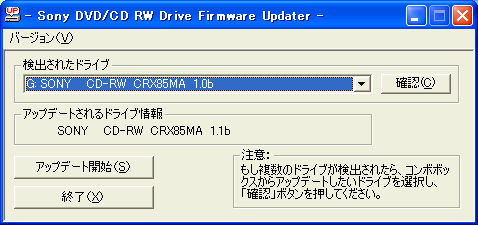 4. 次のダイアログボックスが表示されますので、「検出されたドライブ」の「SONY CD-RW CRX85MA」の後に表示されているバージョンを確認してください。