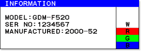 OSD操作または、メニューボタン操作により、「機種名」「製造年/週」「シリアル番号」が表示される機能です。企業等での一括導入時などに、システム管理者の管理工数を低減できる便利な機能です。 |
