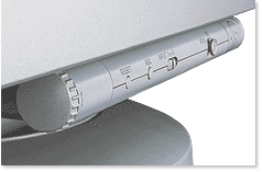 GDM-FW900には、ロールイン・コントロールスティックを採用しました。リセットボタン、オートサイズセンターボタン、入力切り換え(INPUT1/2) スイッチ、メニュー(OSD)ボタンなど、比較的使用頻度の低いボタン類をパネル下のスティック部にまとめたものです。(電源スイッチは除く)通常使用時はこのスティックを回転させて、使用頻度の低いボタン類を格納することで誤操作を防止することができます。また精悍ですっきりたフェイスデザインを演出するとともに、シンプルな操作感を実現しました。 |