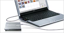 | フォトストレージはパソコンの外付けハードディスクとして、プライベートだけでなくビジネスにも大活躍します。例えば、自分のパソコンに入っている重要なファイルのバックアップや、外出先で急なデータコピーが必要な場合も、40GBのハードディスクをフルに活用できます。“メモリースティック”やコンパクトフラッシュのリーダー/ライターとしても使え、シーンに合わせて用途もさまざま。遊びに、仕事に、どこに持ち歩いても役立つ1台です。 |