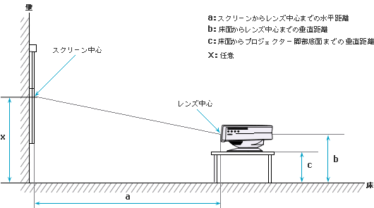 a:プロジェクターを横方向にずらして設置し「サイドショット」を使用する場合、あるいはプロジェクターのレンズ中央がスクリーンの中央に来るように設置する場合の最短の投影距離です(スクリーン―レンズ中央間)。 b:プロジェクターを横方向にずらして設置し「サイドショット」を使用する場合、あるいはプロジェクターのレンズ中央がスクリーンの中央に来るように設置する場合の最長の投影距離です(スクリーン―レンズ中央間)。 c:プロジェクターを横方向にずらしてaの投影距離で設置した場合、スクリーンの右端/左端とレンズ中央とは水平方向に最大cまで離すことができます。 d:プロジェクターを横方向にずらしてbの投影距離で設置した場合、スクリーンの右端/左端とレンズ中央とは水平方向に最大dまで離すことができます。 e:プロジェクターを横方向にずらしてaの投影距離で設置した場合、スクリーンの下端とレンズ中央とは水平方向に最大eまで離すことができます。 f:プロジェクターを横方向にずらしてbの投影距離で設置した場合、スクリーンの下端とレンズ中央とは水平方向に最大fまで離すことができます。 |