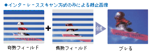 奇数/偶数フィールドの間に1/60秒の時間差があるため、合成した時に被写体の動きによるブレが生じてしまう。 |