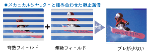 メカニカルシャッターで奇数/偶数フィールドを同時に取り込み。2つのフィールド感に時間差がないので合成してもブレが少ない。 |