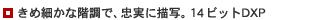 14ビットDXP(Digital eXtended Processor:14ビットA/D変換)を採用。当社従来方式に比べ、信号処理能力の向上でデジタルノイズが大幅に減少、低照度下や黒い被写体の撮影で効果を発揮します。また、映像信号のダイナミックレンジ拡大により、いままでは白トビしていた高輝度部分も忠実に描写します。