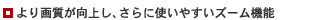 155万画素メガピクセルCCDと、「プレシジョンデジタルズーム※」により、デジタルズーム撮影時の画質が50%向上(当社従来68万画素CCD比)。高倍率ズーム撮影も画質劣化の少ない映像で残せるほか、20倍までと120倍までの2段階から倍率を選ぶことが可能です。また、光学時には、1倍から10倍までわずか0.3秒(カメラスタンバイ時)でズーミング可能な「リニアマッハズーム」を搭載。新アクティブイメージエリア方式手ブレ補正機能により、ズームアップ時や近接撮影時に起こりがちなブレを抑えることができます。