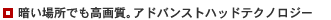 | PC120では、CCDに、低照度下での画像ノイズを低減するアドバンストハッドテクノロジーを採用。1/4型の小型タイプCCDながら、暗い場所や黒い被写体の撮影でもノイズの少ない高画質な撮影ができます。 |