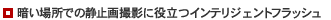 フォト撮影用フラッシュを搭載。オートポップアップ機能により、周囲の明るさに応じて自動的にフラッシュがポップアップし、発光します。撮影状況に応じた、オート/赤目軽減/強制発光/発光禁止の4モードを搭載。自動光量調整機能により、適正露出で撮影できます。
