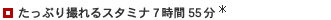 | ※連続撮影時間は、1本の満充電したバッテリーを使用して、25℃で連続撮影した場合の時間、実撮影時間は撮影、ズーム、撮影スタンバイ、電源ON/OFFを繰り返した時の撮影時間の目安です。ビデオ再生など、撮影以外の操作は含まれていません。実際にはこれより短くなる場合があります。 |