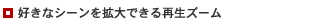 再生画の一部の範囲を1.1倍から5倍までズームアップする機能です。拡大したい部分は、選択/決定ダイヤルを使って上下左右に動かして指定できます。テープ上の動画や静止画だけでなく、“メモリースティック”内の静止画も拡大することが可能。メモリーモード時に、“メモリースティック”内の静止画が再生ズームされた場合、DV入出力端子から出力できます※。