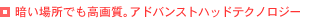 CCDに、低照度下での画像ノイズを低減するアドバンストハッドテクノロジー採用。1/4.7型の小型CCDながら、暗い場所や黒い被写体の撮影でもノイズの少ない高画質な撮影が楽しめます。 |