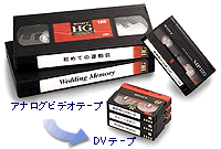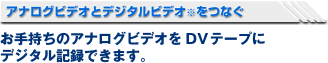アナログビデオとデジタルビデオ※を本機に接続して、手軽にアナログ-DV変換ができます。 アナログ入力機能のないDV機器でも8ミリ/VHSテープからのデジタル記録が可能、録画後の画質劣化がほとんどなくコンパクトに保存できます。
