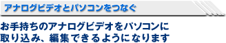 *【アナログビデオ映像をパソコンに取り込むための条件】●パソコン側のDV信号の取り込み/書き出し機能と、本機を介した動作に対応していること。●ソニーの「バイオ」シリーズと組み合わせて動画編集を行う場合:DV端子(i.LINK端子)を搭載した「バイオ」で、〈DVgate motion〉のVer.1.2かそれ以降のバージョンがインストールされていること。
