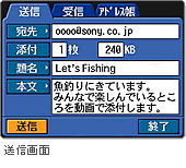「送信画面」で相手のアドレス・題名・本文を入力し、送りたいムービーのファイルを添付します。