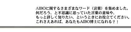 AIBOの感情や要求を表すAIBO専用の言葉で、AIBOが活動中に時折発する「ピロピロ」音のことを指す。ひとつひとつのAIBO語には意味があり、また年代・性格によってそれぞれ違うAIBO語を話す。 |