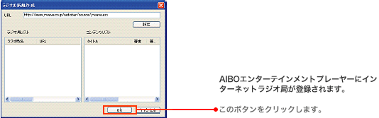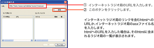 | インターネットラジオ局のURL、またはasxファイル名を入力し「設定」をクリックする。 |