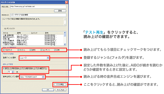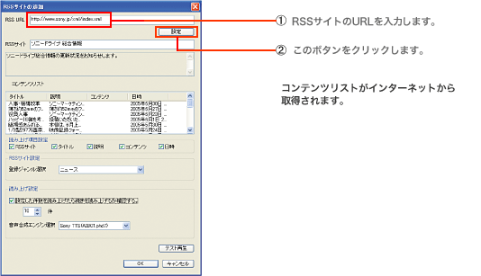 読み上げてもらう項目や音声合成エンジンなどを設定する。