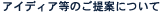 皆様よりソニーマーケティングへ、新しい商品、技術、デザイン、製造方法、広告宣伝、マーケティング等に関するアイディア、メモ、図画、コンセプトその他のご提案(以下、ご提案といいます)をされたい、とのご希望を伺うことがあります。一方で、ソニーマーケティングでも日頃より様々な分野で独自の研究および開発等を行っており、ソニーマーケティングが独自で考え出した未発表のアイディアと、皆様のご提案が偶然にも大変類似してしまう、という可能性がございます。また、その事により皆様との間に誤解や紛争が生ずる可能性もございます。ソニーマーケティングでは、こうした将来発生しうる不測の事態を避ける為、原則として皆様からのご提案をお受けすることはご遠慮させて頂いております。何卒ご協力のほど、お願い申し上げます。