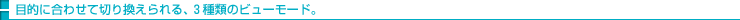 通常の画面で映像を再生する「ノーマルビュー」、約300倍速で再生する「高速プレビュー」、番組タイトルを一覧できる「リストビュー」を装備。リモコンの[ビュー]ボタンで、お好みのビューモードに切り換えて、見たい番組を探すことができます。