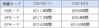 CSV-EX11には500GB、CSV-EX9には250GBのハードディスクを搭載。録画モードは、画質の違う3種類(HQ/SP/EP)から選択できます。CSV-EX11ならEPモードで最長約342時間、高画質なHQモードでも最長約114時間の録画が可能です。