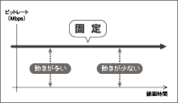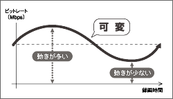 録画時に映像を圧縮する際、最適な圧縮率を自動選択する「Variable Bit Rate(バリアブル・ビットレート)」を採用。従来のCBRシステムでは、どんな映像にもビットレートは固定でしたが、「Variable Bit Rate」システムでは、動きの多い画像には多くのビットを割り当てるなど、画像に合わせて自動調整します。たとえば、激しいアクションシーンではビットレートを高くし、動きの少ない場面ではセーブすることで、一定の画質を保ち、ザラつきのないなめらかな映像を実現します。