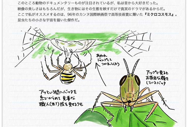| 『ミクロコスモス』のおもしろさは、普段何気なく見ている小さなアリやクモや蚊を、画面いっぱいのドアップで観る迫力にある。その造形とデザインは、ユニークで未来的だ。数々のキャラクターに流用されたのも無理はない。ガの幼虫やバッタの顔は、お茶目なアホヅラで観ていて本当に楽しくなる。 |