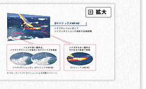 画面のノイズの量を自動解析。刻々と変化するノイズの増減に追随、映像に合わせた最適なノイズリダクションを行います。録画映像の再生時だけでなく、内蔵チューナーでハイビジョン映像を視聴する場合にも効果を発揮。 |