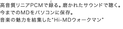 付属品:ヘッドホン、漢字表示対応スティック・コントローラー(バックライト付き)、USBケーブル、アプリケーションソフトウェア「SonicStage Ver.3.4」「MDシンプルバーナー Ver.2.0」「Hi-MD Music Transfer for Mac Ver.1.0」(CD-ROM)、充電池(LIP-4WM)、キャリングポーチ、マルチボルテージACアダプター